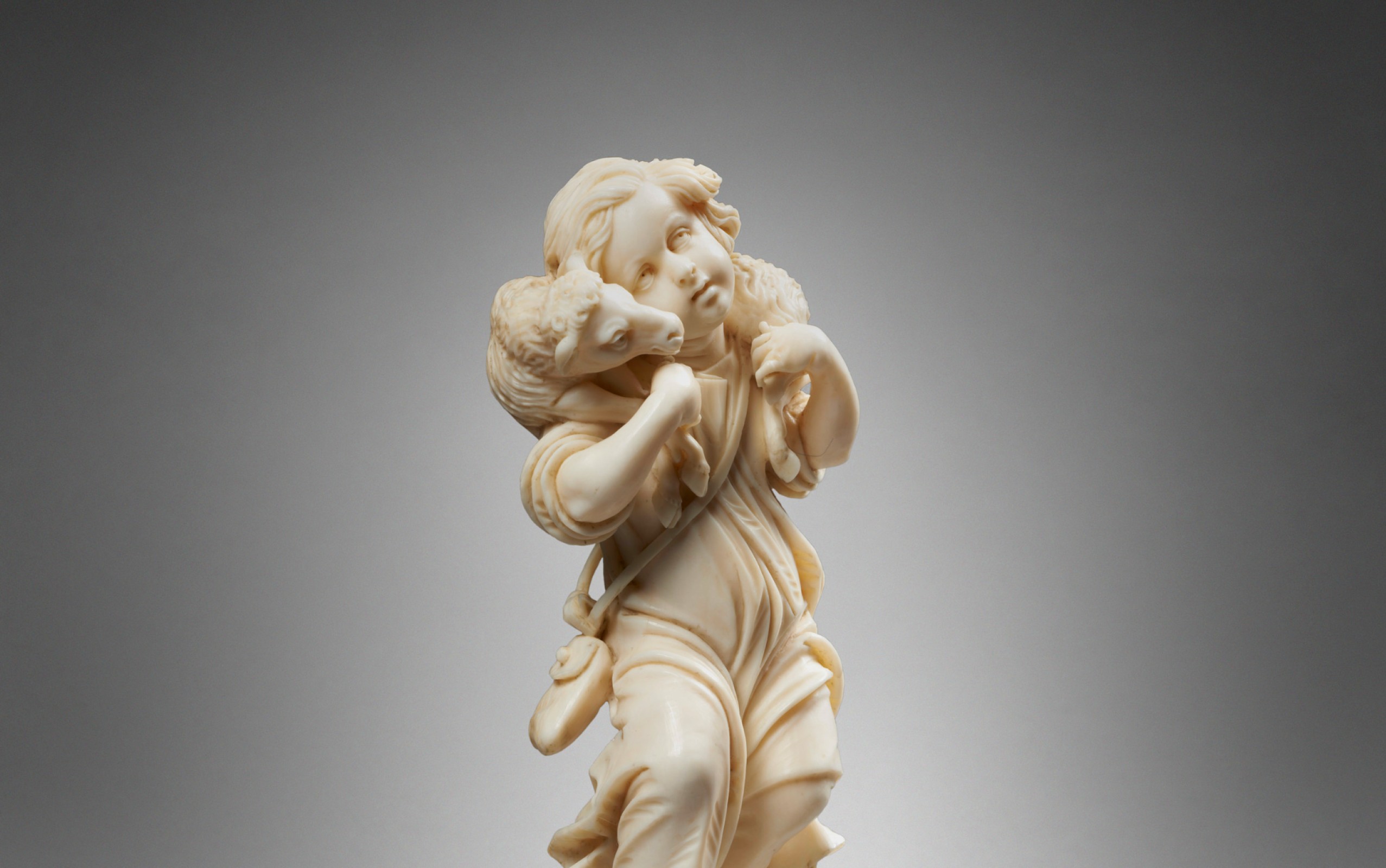 Dressed in a tunic with a twirling drape, a young child is walking forward, carrying on his shoulders a small lamb which he holds by the legs. With an audacious technical virtuosity, this small Good Shepherd ivory amazes by the graphic and nervous treatment of the garment, the expressiveness of the face and the moving representation of his young flesh. Recently rediscovered, it is one the best ivory works by Christoph Daniel Schenck, an active sculptor for the Counter-Reformation in the region of Constance at the end of the XVIIth century.