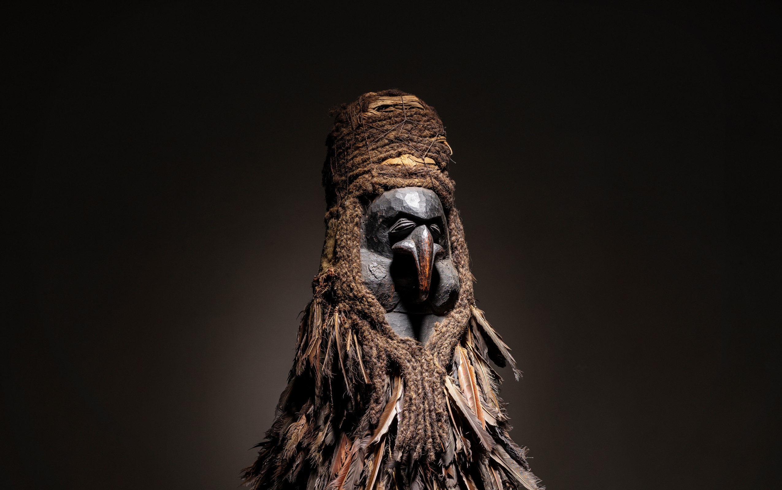 This spectacular costume with mask comes from New Caledonia. Richness and variety of the materials, care taken in the treatment of the volumes, high quality of the basketwork, choice of dark tones: such are the features of this newly acquired Apouéma mask. If it could speak, this mask would tell us much on the life, death, and afterlife of the Kanaks