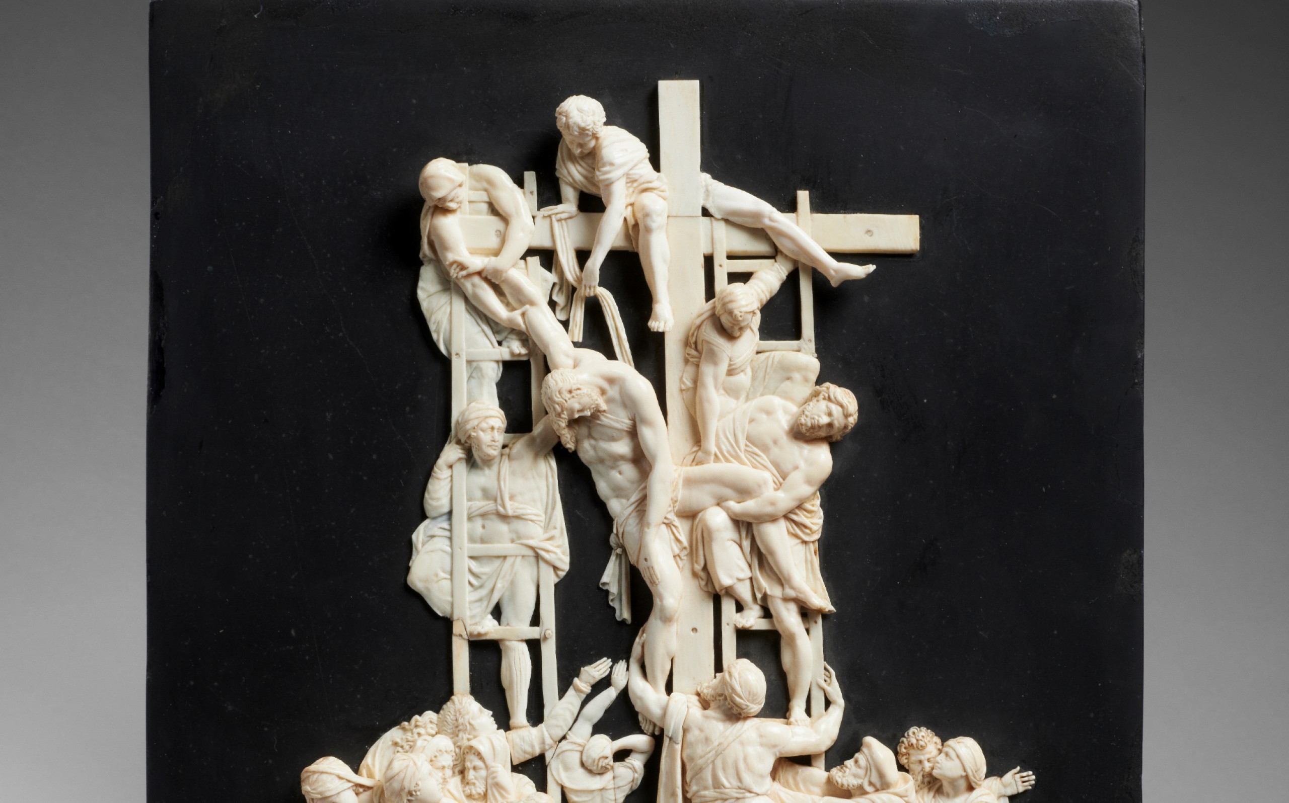 Carved with virtuosity in thin plaques of ivory applied on a slate background – added presumably later -, this bas-relief figuring the Descent from the Cross is laid out on two levels.