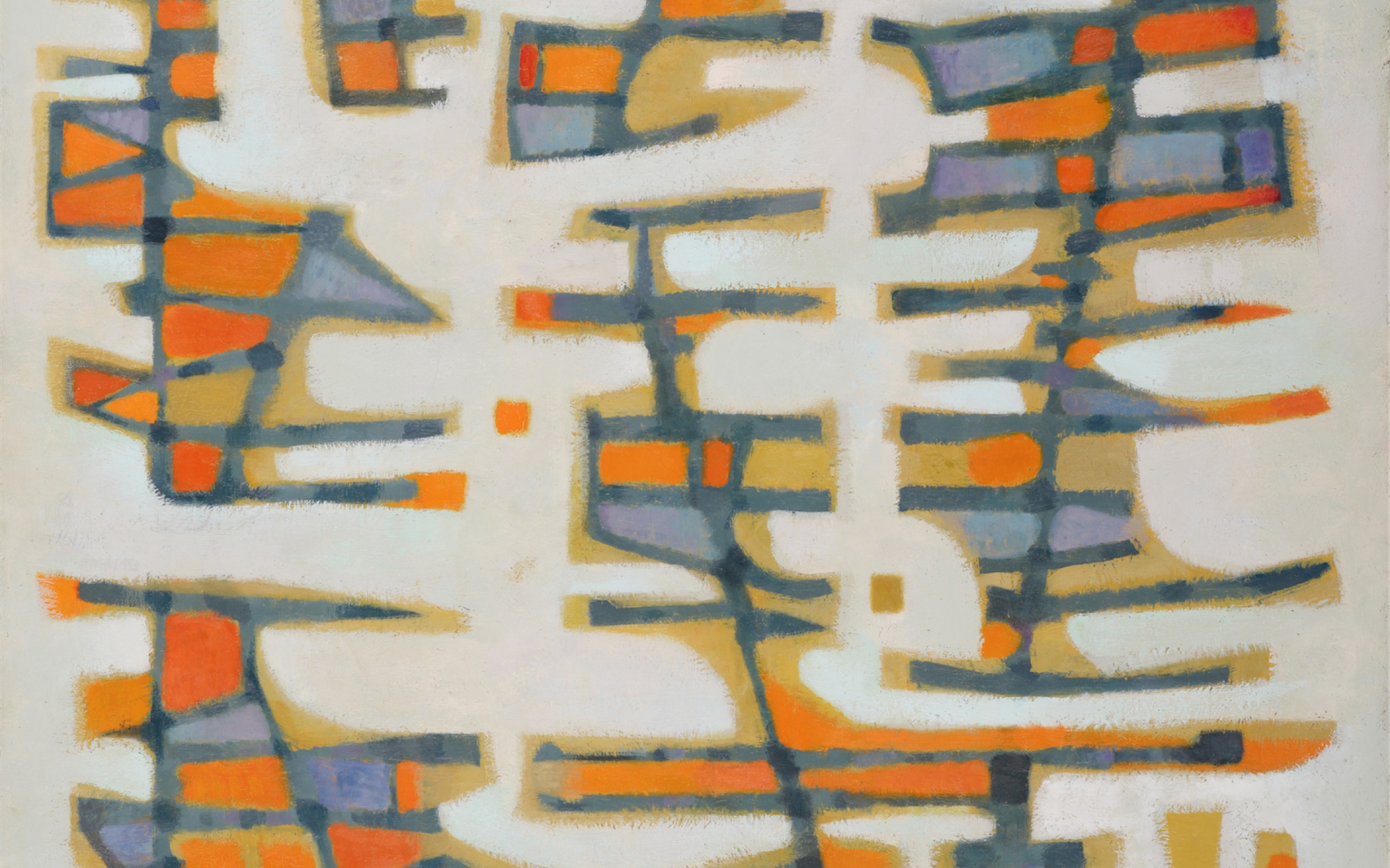 Back in the studio, Alfred Manessier composed works from his sketches and the colourful impressions he recalled. A year and a half later, the artist unveiled the results of his Dutch experience at the Galerie de France, namely, eighteen paintings including Polders enneigés [Snow-Covered Polders] and the equally poetic Près d’Harlem [Near Harlem]. The two paintings both feature the same blanket of snow, against which stand out forms freely inspired by ports, canals and bridges, all iconic motifs from the Dutch landscape, just like the windmills whose sails turn to drain the water from the polders.
