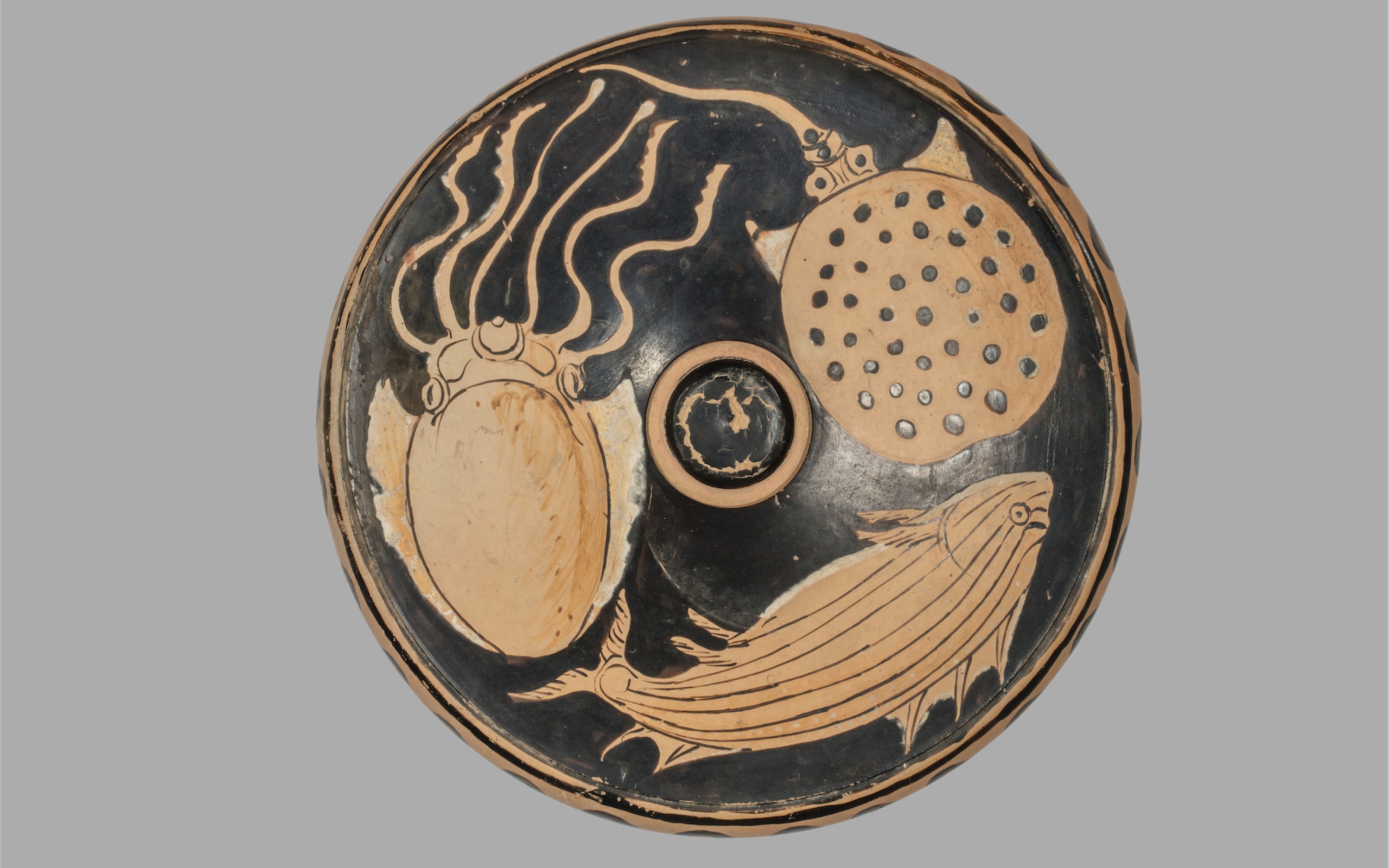 The Fondation Gandur pour l’Art is custodian of a beautiful fish plate produced in Taranto, around 340 BCE. Adorned with a silent trio composed of a mullet, a cutlet and a torpedo-fish floating on the darkness of the seabed, it stands out with some discreet, but nevertheless tasty, fantasies of painter. Indeed, as you will see, these three guys are less innocent than they seem…