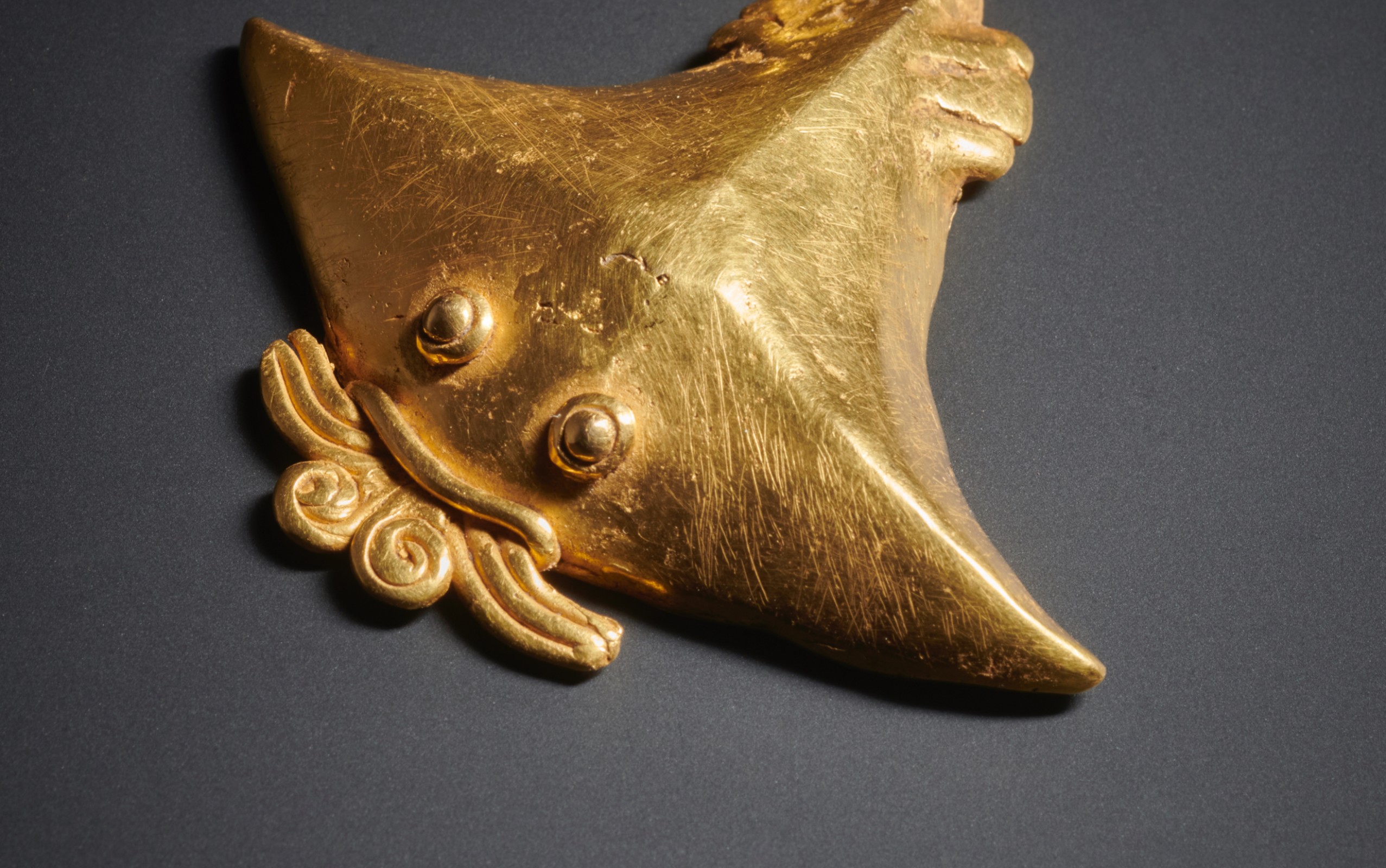 One would appoint a goldsmith of Mesoamerica, in the early 2nd millenium AD, who would first shape the animal’s tail and triangular body, and then add two delicate gold balls for the eyes. Indeed, this pendant is a masterpiece of Coclé or Chiriqui goldsmithery (fig. 1). The craftsman did not try to produce a faithful depiction, but all the elements allowing the immediate identification of the animal are there: a broad, flat body with a pair of wing-like pectoral fins with pointed tips, protruding round eyes, and finally a tail with three pelvic fins and ending with a dorsal fin. In the present case, around the mouth at the top of the object, there are two spiraled loops, surrounded by wavy strips: an artist’s fancy, or perhaps a depiction of the water and sand agitated by the ray? At the back of the piece, a suspension ring enabled to wear it as a pendant.