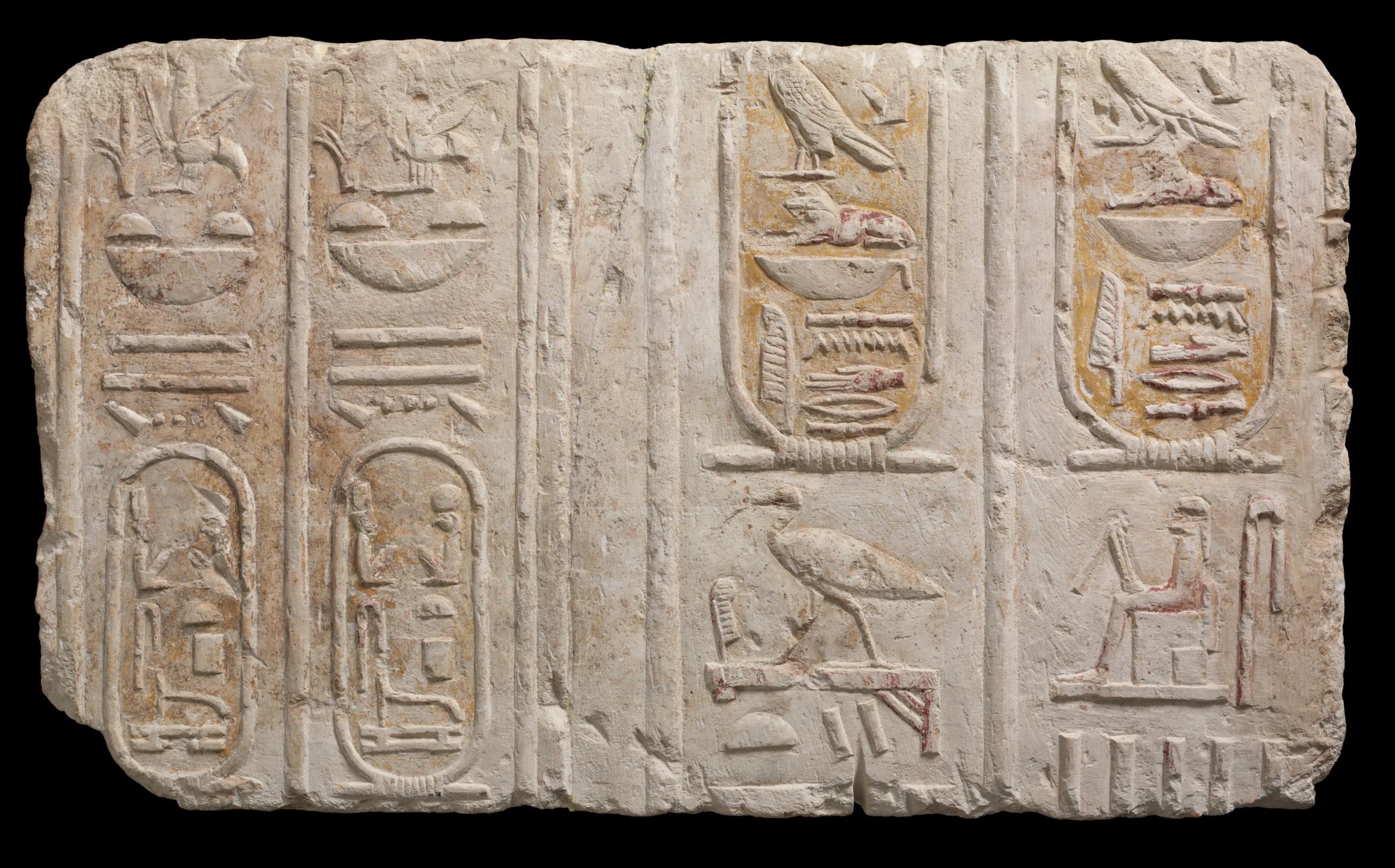 The damaged area on the top and to the left of this hieroglyph can be restored on the basis of parallels. The two cartouches on the right hand side of this relief, which contain the nomen of Alexander, can then be translated, beginning with the leftmost, “…the son of the god Amun, whose name is Alexander, the one who is beloved of the god Thoth, the Lord of [Hermopolis Magna]…” and continuing with the one on the right, “…the son of the god Amun, whose name is Alexander, the one who is beloved of the god Shepsi3 who is in Hermopolis Magna…” The two columns of inscription on the left-hand side are identical and contain the titles and prenomen of Alexander, “… The King of Upper and Lower Egypt, the Lord of the Two Lands, the one who is chosen by the god Re and the one who is beloved of the god Amun…” The inscription identifies the temple to which this door jamb belonged as that located at Hermopolis Magna, which was dedicated to its principal deity, Thoth, god of wisdom and patron of scribes, and his temple sharing partner, Shepsi, an ancient solar god.