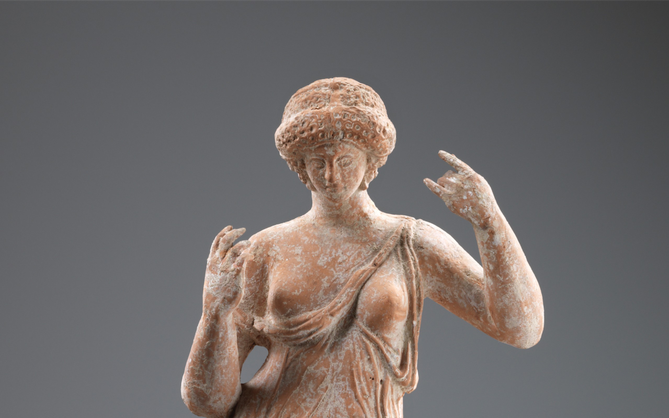 Rare case of an ancient signed statuette, this young woman standing on her small base is Aphrodite, the Greek goddess of beauty and love. The earrings, the naked breast, the form-fitting dress, « wet » folds showing a delicately rounded belly, the coat knotted over the pubis, the naked feet in open sandals, enable this terracotta statue to become a little wonder of grace, and highlight the erotic nature of the goddess. Up to the gesture that Aphrodite performs with her two hands …