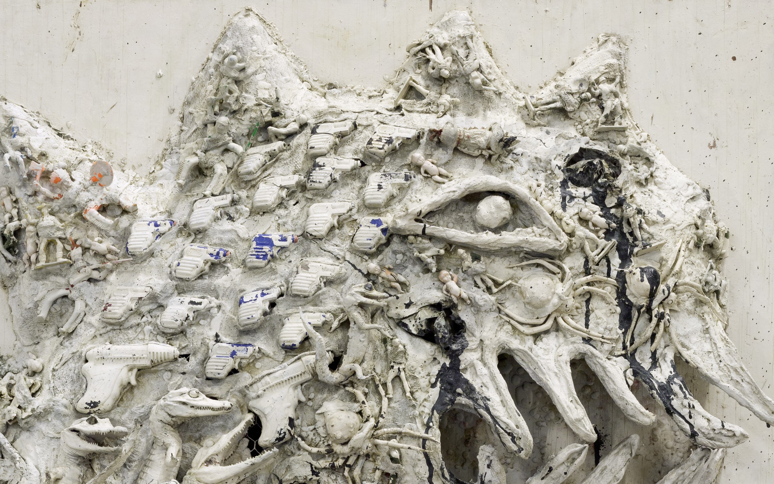 Assemblage of objects, plastic toys and various elements in wood and papier-mâché glued, plastered and painted on wood panel