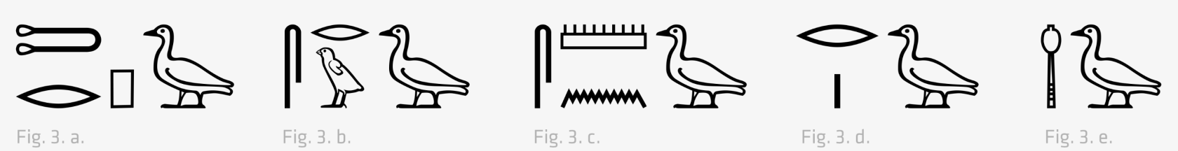This statue is an epigraph, so how can we be sure that it is indeed a Nile goose, and, moreover, a representation of the god Amun? As a matter of fact, several species of geese were known to the ancient Egyptians. As early as the Old Kingdom (2575–2135 BC), procession scenes show that five species were differentiated. However, making the link between hieroglyphic name, modern scientific name, and iconographic representation is no easy task. It seems possible for three of these species: (fig. 3. a) ṯrp, the white-fronted goose, (fig. 3. b) sr, the greylag goose, and (fig. 3. c) smn the Egyptian goose. That leaves the (fig. 3. d) rȝ and (fig. 3. e) ḥḏ geese, which should probably be associated with the red-fronted goose and the bean goose.2 What a barnyard!