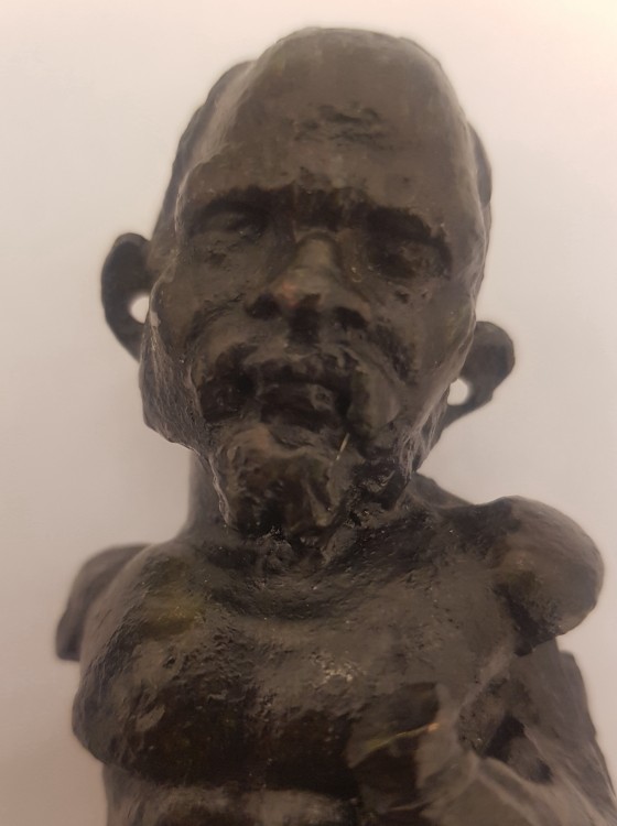 How did a wealthy Alexandrian or Roman citizen consider this statuette? It was only a part of a larger object, perhaps a lamp, as suggested by the two rings under the feet, which enabled to fix the piece on a base, and the circular cavity on top of the skull, which might correspond to a broken tip used to fix the flammable product. Of course, this is a caricature of a slave meant to be seen by free and rich people, who also owned real slaves. Displaying this kind of object was a token of social success13.