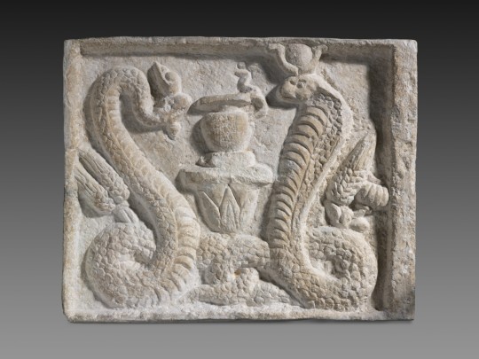 Relief du dieu Sérapis Agathos Daimon et de la déesse Isis Agathé-Tyché
