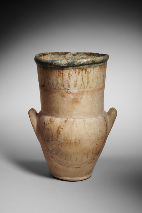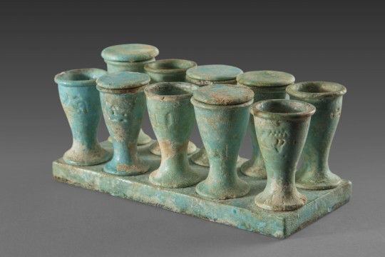 The Fondation Gandur pour l'Art contributes to this exhibition by lending two remarkable objects: a faience plaque with ten ointment vases (7th-4th century BC, Egypt) and a decorated and inscribed vase with rounded handles (1250-1000 BC, Egypt). These pieces offer valuable insights into the heritage of antiquity.