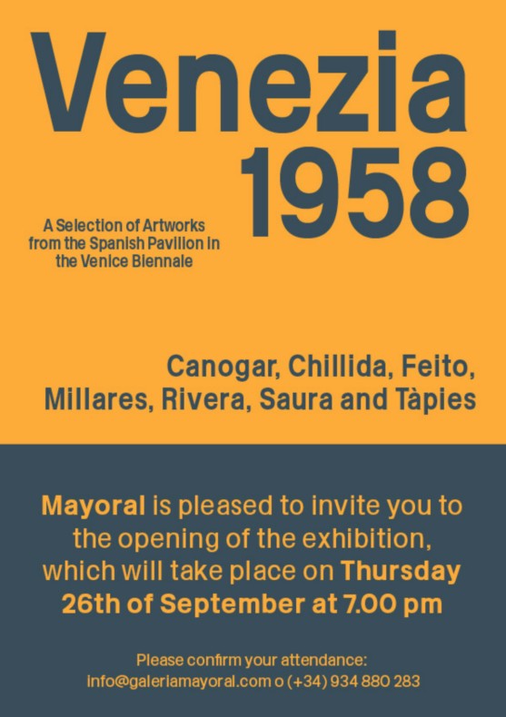 With the exhibition Venezia 1958, the gallery revisits an episode that marked a turning point in international recognition of Spanish art of the second half of the 20th century, both with regard to the dissemination of Spanish Informal Art and for the artists who took part in it. This project, as well as bringing together and displaying some of the artworks shown in Venice in 1958, also aims to analyse the pertinence and consequences of an exhibition-event held at a time when the Franco regime was particularly keen to present an image of modernity abroad.