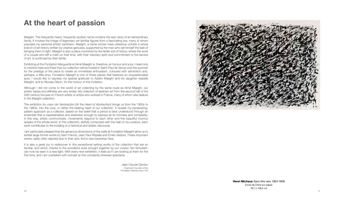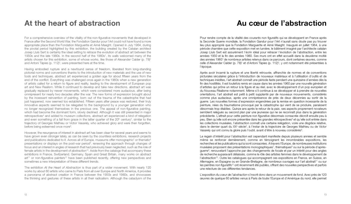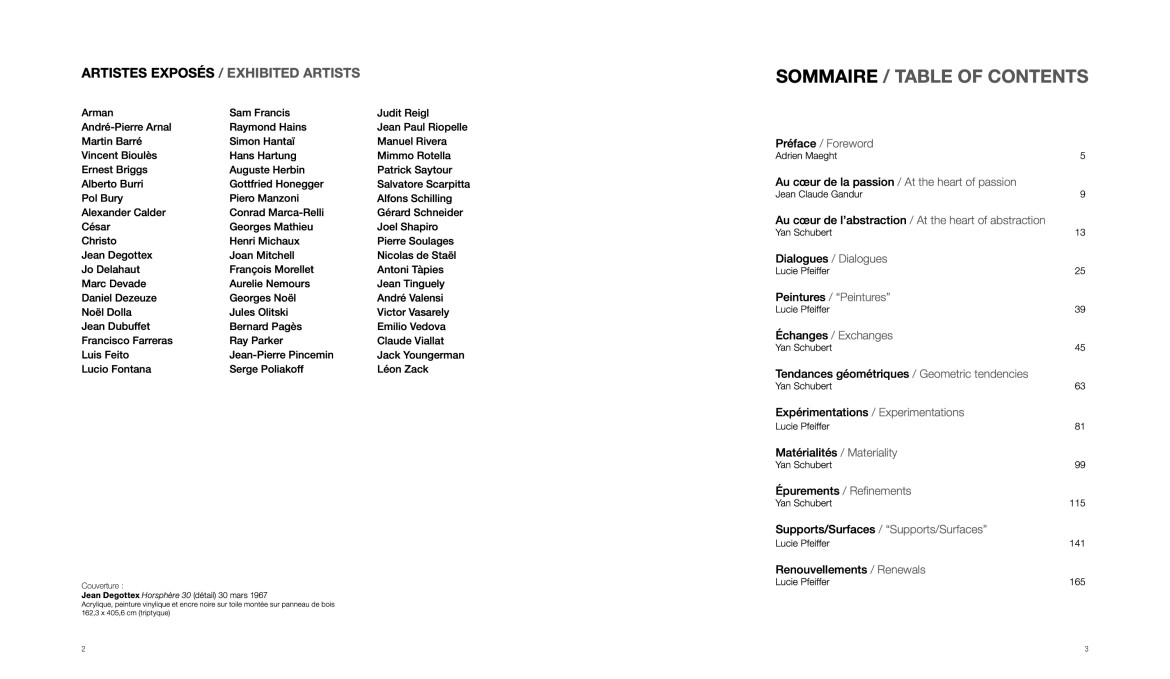 The bilingual catalogue Au cœur de l'abstraction. Collection de la Fondation Gandur pour l'Art [At the Heart of Abstraction. Collection Fondation Gandur pour l'Art] accompanies the exhibition presented from 2 July to 20 November 2022 at the Fondation Maeght (Saint-Paul de Vence, France), and offers a fascinating immersion into abstraction from the 1950s to the 1980s. Under the direction of Yan Schubert, curator of the fine arts collection and of the exhibition, whose texts appear alongside those of Adrien Maeght, Jean Claude Gandur and Lucie Pfeiffer, the book unveils all of the 100 works exhibited.