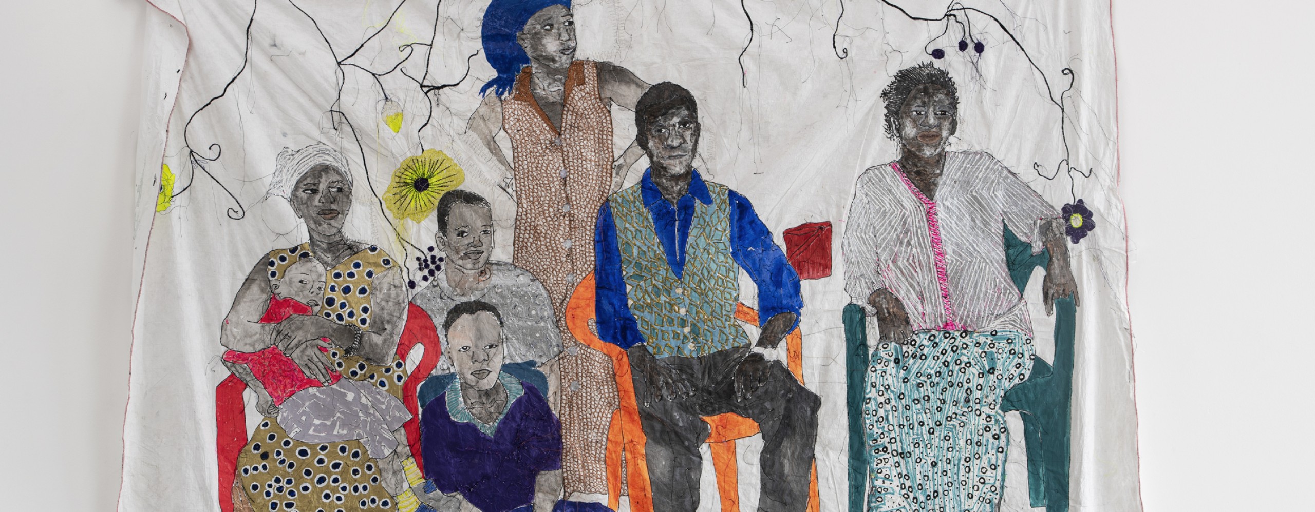 The artist Ana Silva based in Lisbon weaves metaphorical and literal family ties between the figures represented in her work. In her series of family portraits, from which the present work is taken, seven figures and as many gazes face the public, in a setting reminiscent of Malick Sidibé's or Seydou Keïta's studio photography. Organic plant motifs link the various figures to each other. In this series, women play a predominant role, and in particular the transmission from the elders to the youngest, from the grandmother to the granddaughter. Strong and delicate links are embodied by the materials chosen by the artist. In Family Portrait 7, a Tyvek paper is the support for the work, a fabric usually used to wrap art objects, while here it uncovers and supports the family ties embroidered by the artist.