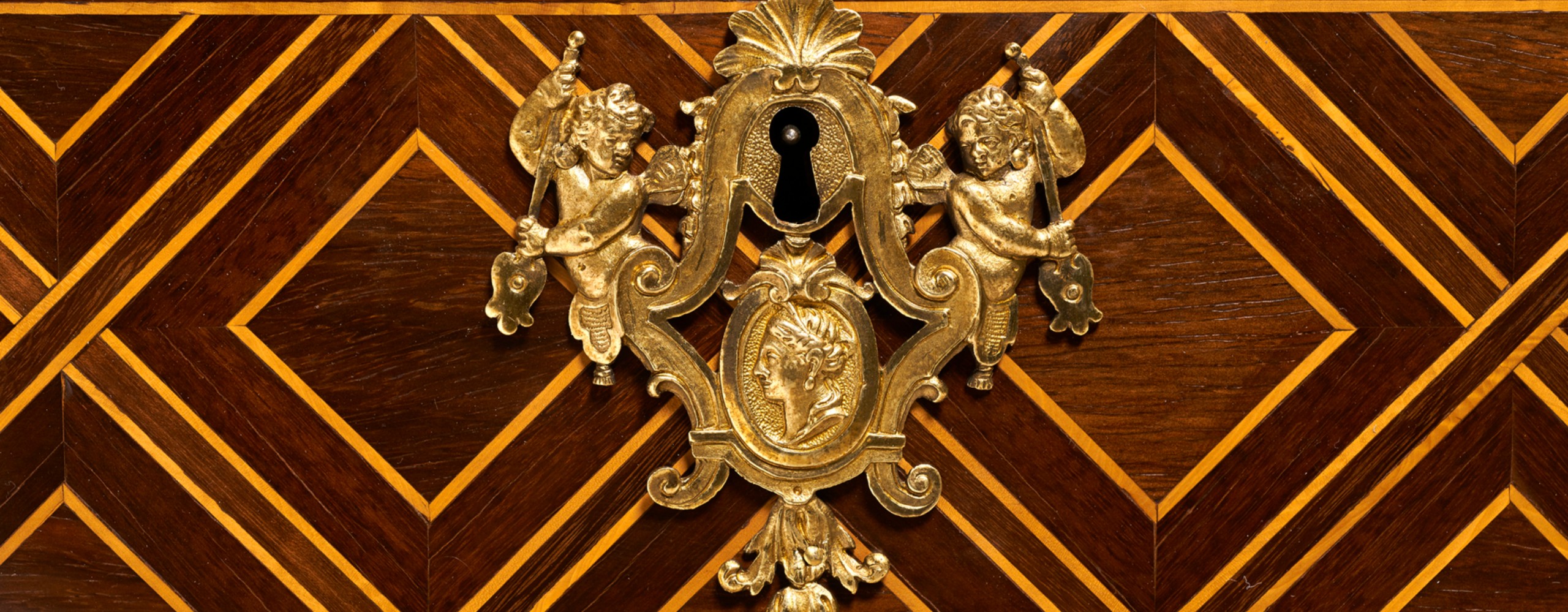 S’y ajoute un important ensemble de meubles et d’objets d’art, qui, à travers le luxe de leurs matériaux et la qualité de leur exécution, constituent un reflet de l’art de vivre des élites cultivées et un témoignage du haut savoir-faire des artisans. Marqueteries de bois, d’écaille, de nacre et de pierres dures, laques et porcelaines d’Extrême-Orient, émaux, majoliques et bronzes dorés s’associent dans des combinaisons toujours réinventées. Un petit bonheur-du-jour de Daniel Deloose, réalisé vers 1785, allie ainsi la délicatesse graphique du placage de satiné et d’amarante et la subtilité des ornements de bronze à l’exotisme raffiné des panneaux de laque japonais. La multiplicité des tiroirs et cachettes dissimulés sous l’abattant traduit l’usage intime du meuble, plutôt réservé à un univers féminin.