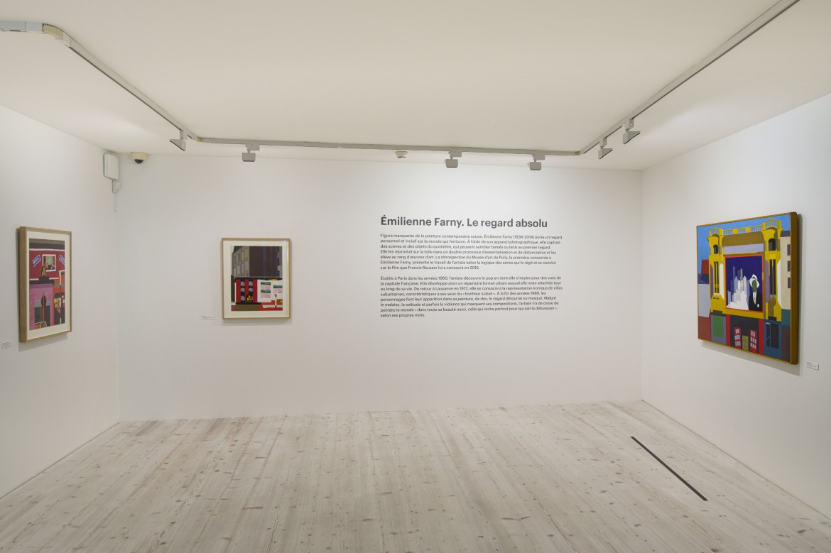 Figure marquante de la peinture contemporaine suisse, Émilienne Farny (1938-2014) porte un regard personnel et incisif sur le monde qui l’entoure. À l’aide de son appareil photographique, l’artiste capture le quotidien qu’elle reproduit ensuite sur toile. Établie à Paris dans les années 1960 après une formation à l’École cantonale des beaux-arts de Lausanne, l’artiste découvre le pop art dont elle s’inspire pour des vues de la capitale française. Chantiers, panneaux publicitaires et devantures de boutiques constituent alors les premiers éléments du répertoire formel urbain qu’elle développe tout au long de sa vie. De retour à Lausanne en 1972, elle se consacre à la représentation ironique de villas suburbaines, caractéristiques à ses yeux du « bonheur suisse ».