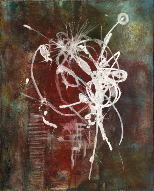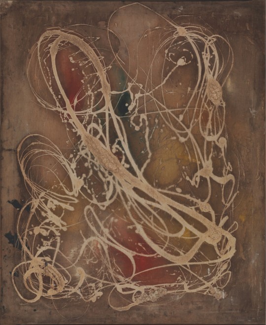 La Fondation Gandur pour l’Art vient enrichir cette lecture rétrospective, soulignant l’apport fondamental de Mathieu à l’art du XXe siècle, avec deux prêts exceptionnels : Évanescence (1945) et Phosphène (1948). Ces œuvres primordiales, parentes de celles élaborées par Wols au même moment, présentent des motifs alternant graphismes abstraits et formes d’inspiration organique, au moyen de taches, de coulées et de projections.