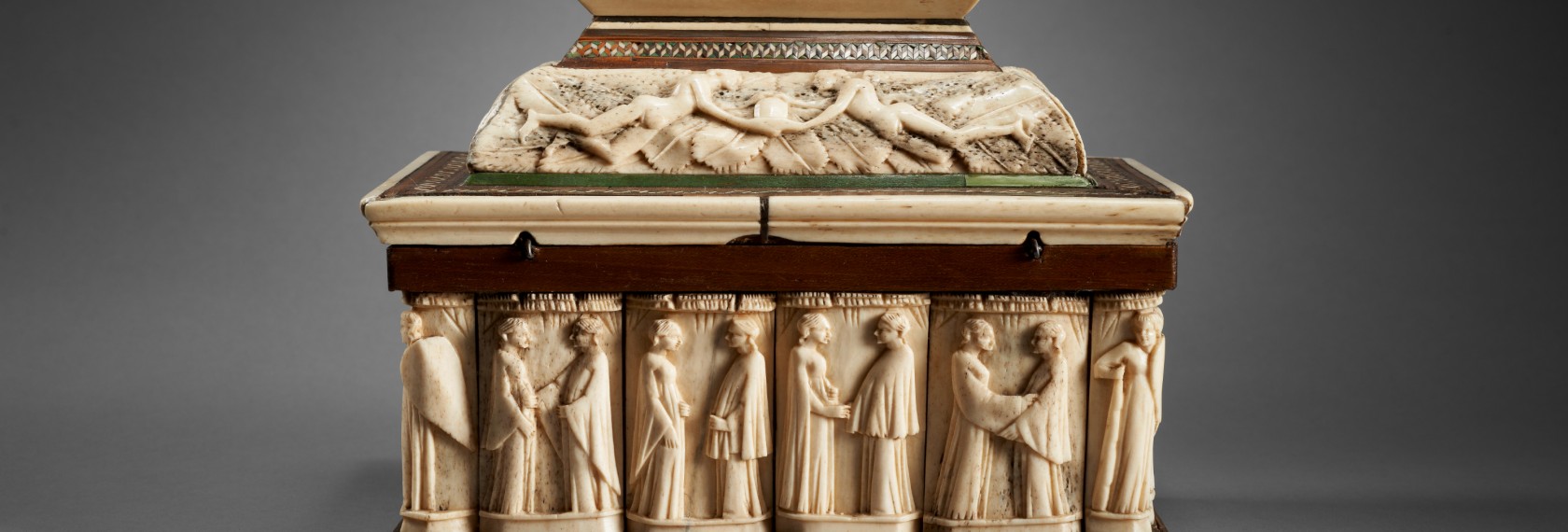 Ce coffret de forme quadrangulaire, orné de motifs géométriques polychromes, présente sur ses parois une frise de plaquettes d’os sculptées en relief et fixées sur une âme de bois, figurant des couples en conversation, dans des attitudes codifiées empreintes de retenue. Ces caractéristiques l’apparentent à la production, très particulière, de l’atelier dit « des Embriachi », actif à Venise dans les premières années du XVe siècle. Elles le rattachent aussi à un type d’objet qui jouait alors un rôle essentiel dans la vie conjugale à la Renaissance : les coffrets de mariage.