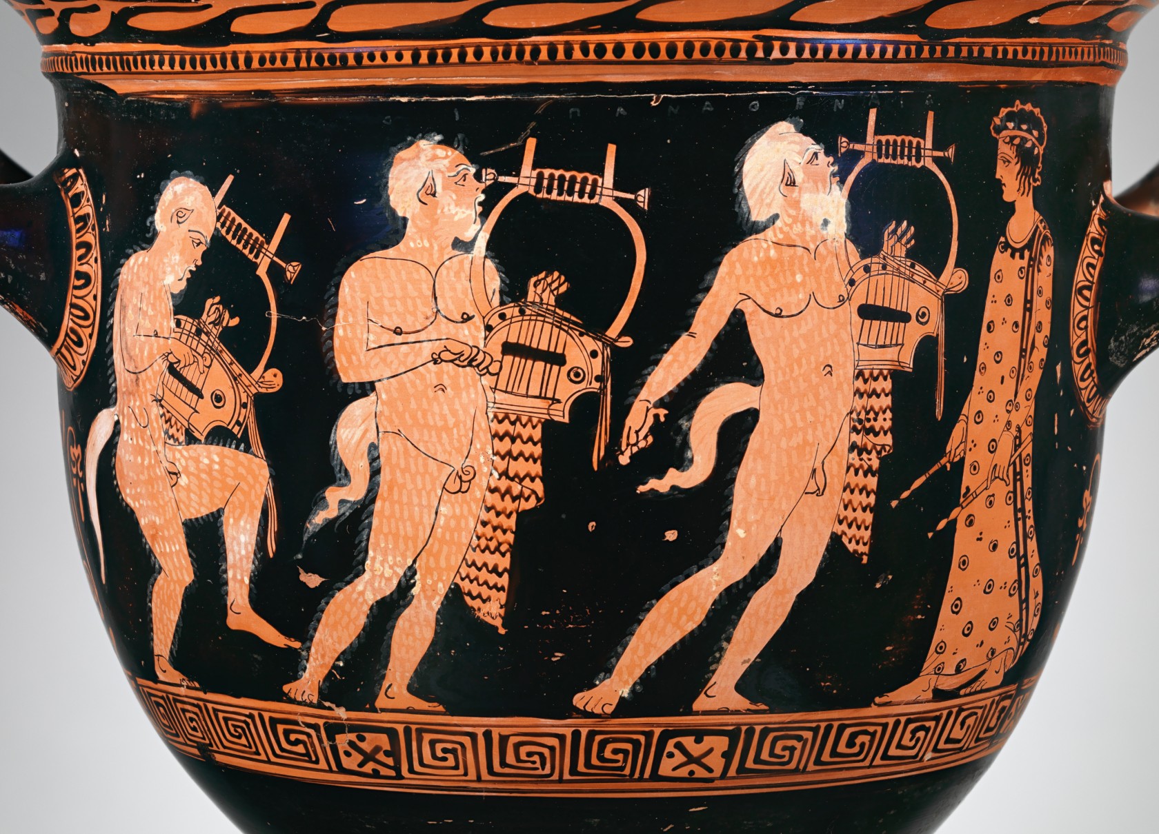 Parmi ces satyres, qui sont tous de jeunes godelureaux peu fiables, à la sexualité animale et exubérante, il en est un qui se distingue : c’est un vieux et gros satyre nommé Silène, à qui l’âge a apporté la sagesse (mais non la sobriété). On le nomme parfois Papposilène, « grand-père Silène ». Il est parfait dans un rôle d’échanson (comme sur une autre statue de nos collections, fig. 2), il danse aussi très bien et a, de surcroît, des talents de chanteur. Sur un vase attribué au peintre Polion, daté de 420, trois Silènes, aux poils blancs, aux oreilles animales, pincent la cithare devant un aède (fig. 3). Une inscription portée sur le vase les identifie ironiquement aux « chanteurs des Panathénées », immortalisés dans des attitudes qui évoquent les différents pas d’une danse8.