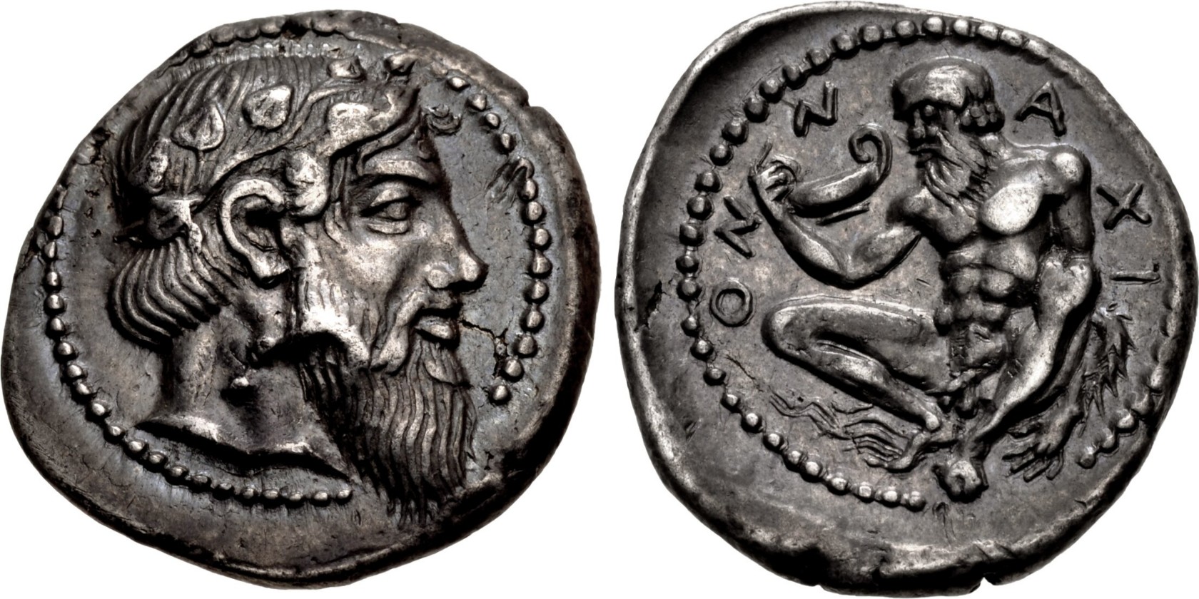 Plus aucun doute n’est permis : notre petit bonhomme assis est un Silène. Il est assis par terre, tout seul, pour boire son vin : une posture et une solitude qui siéent à un être sauvage, qui se moque bien des règles de convivialité du banquet grec. En Grèce ancienne, cette position n’est d’ailleurs permise qu’aux enfants et aux esclaves9. Et surtout, au mépris total des usages, il s’enivre seul… Le motif du silène ivre, assis par terre, une coupe à la main, s’est largement diffusé dans le monde classique, dès le milieu du Ve siècle, en Étrurie, en Italie du Sud, en Sicile (sur une drachme en argent de Naxos datée de 461 -430, fig. 4) et en Grèce10.