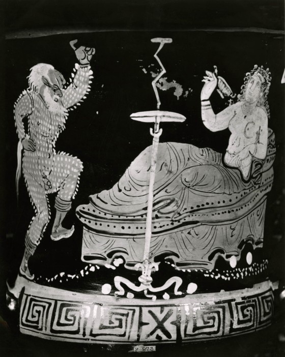 Car un maillot de corps en poils, fait de bandes horizontales composées de petites mèches, est l’autre particularité vestimentaire qui sème le doute sur l’identité réelle du personnage. Qui est-il ? Est-ce un Silène, ou un personnage déguisé en Silène ? En effet, à la fin de l’époque classique, l’iconographie dionysiaque se montre très réceptive à l’art du théâtre, dont Dionysos est aussi le dieu protecteur. Ainsi, plusieurs vases d’Italie du Sud nous montrent des scènes où des acteurs sont vêtus de ce genre de costume. Sur le vase du peintre de Pronomos, dont une scène évoque les coulisses d’un théâtre, deux acteurs se font face : l’un, habillé en Héraclès, masque à la main, l’autre en costume poilu, masque de Papposilène à la main17. Sur un vase attribué au peintre de Schlaepfer, une femme (peut-être Ariane, l’épouse de Dionysos ?), allongée sur un lit de banquet, joue au cottabe, tandis que Silène en maillot poilu, – et sans masque – gesticule en sautillant devant elle18 (fig. 5). Deux vases du IVe siècle avant notre ère, qui, parmi d’autres, témoignent de l’influence du théâtre sur l’art des peintres.