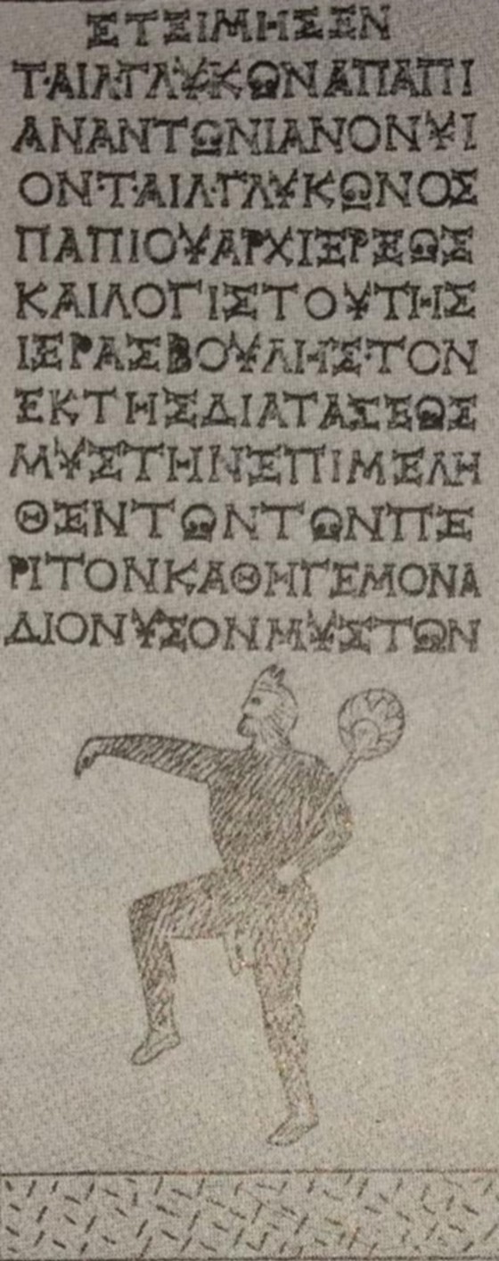 - Jaccottet, Choisir Dionysos, II, p. 240-242 n° 142 (Éphèse, daté de l’époque de Commode, fin du IIe siècle de notre ère) et n° 143.