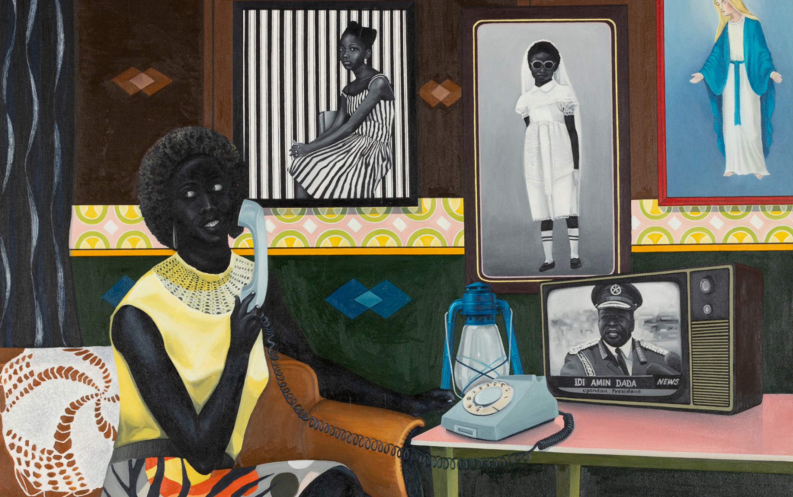 Dans l’œuvre The Telephone Call, se déploie ainsi un intérieur soigné dont des éléments tels que la table, le téléviseur, mais également le tapis, les vêtements du personnage principal, les tapisseries et décorations murales nous transportent dans les années 1970. Une femme, représentée dans la partie gauche de l’œuvre, est assise sur un canapé. Tandis que son bras gauche est nonchalamment posé sur l’un des accoudoirs, son bras droit soutient le téléphone de couleur bleu clair porté à son oreille. Tout autour d’elle, une série d’images nous informe sur le contexte social et politique qui est le sien. Au centre du mur trônent deux photographies. La première évoque les portraits de studio qui ont essaimé dans l’Ouest et le centre du continent africain, et dont Malick Sidibé est devenu l’une des figures emblématiques – l’arrière-plan aux lignes verticales alternées entre blanc et noir rappelle indéniablement certaines de ses images et font ressortir singulièrement le corps de la jeune fille assise sur une chaise qui y est représenté. S’agit-il là d’une image de jeunesse de la femme maintenant assise dans son salon qui nous fait face ? De sa fille, sa nièce ?