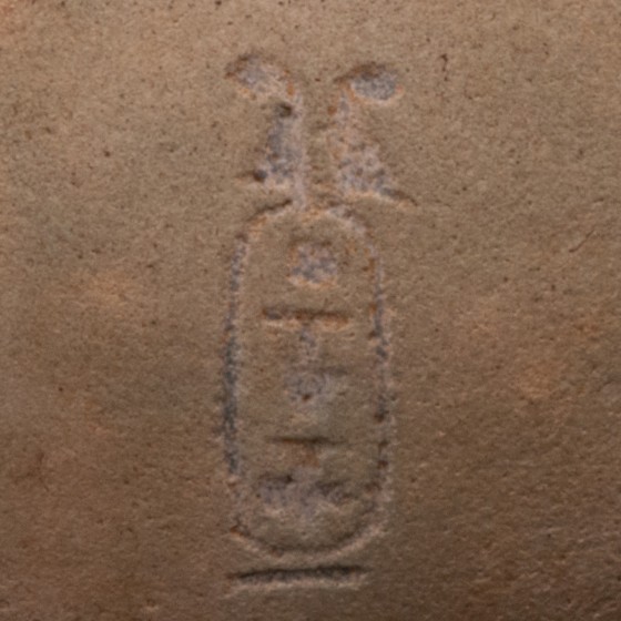 Un détail encore à noter sur cette gourde du nouvel an permet de la classer parmi une catégorie relativement rare. Quelques signes hiéroglyphiques sont inscrits dans un ovale surmonté de deux plumes d’autruches, au centre de l’une des faces lenticulaires :