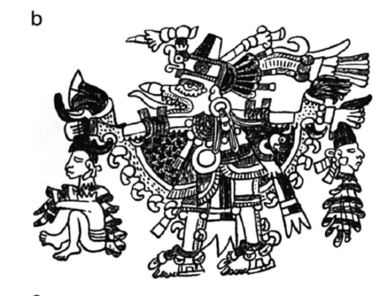 Vaste sujet que celui des chauves-souris dans l’Amérique précolombienne. Les Mayas classaient les chauves-souris (Sotz, dans les langues mayas) non parmi les mammifères, mais parmi les oiseaux10, raison pour laquelle on les gratifie d’une queue d’oiseau. Frugivores, carnivores, insectivores ou hématophages, elles ont, dans l’imagerie et dans les mythes, des rôles différents qui varient en fonction de leur nature. C’est donc un animal polysémique, tantôt connoté positivement, tantôt négativement. Bénéfique, la chauve-souris pouvait remplir des fonctions de messagère des dieux ; c’était aussi un être divin chargé de la pollinisation et la fertilisation, associée alors au colibri11.