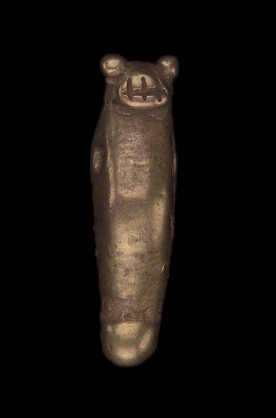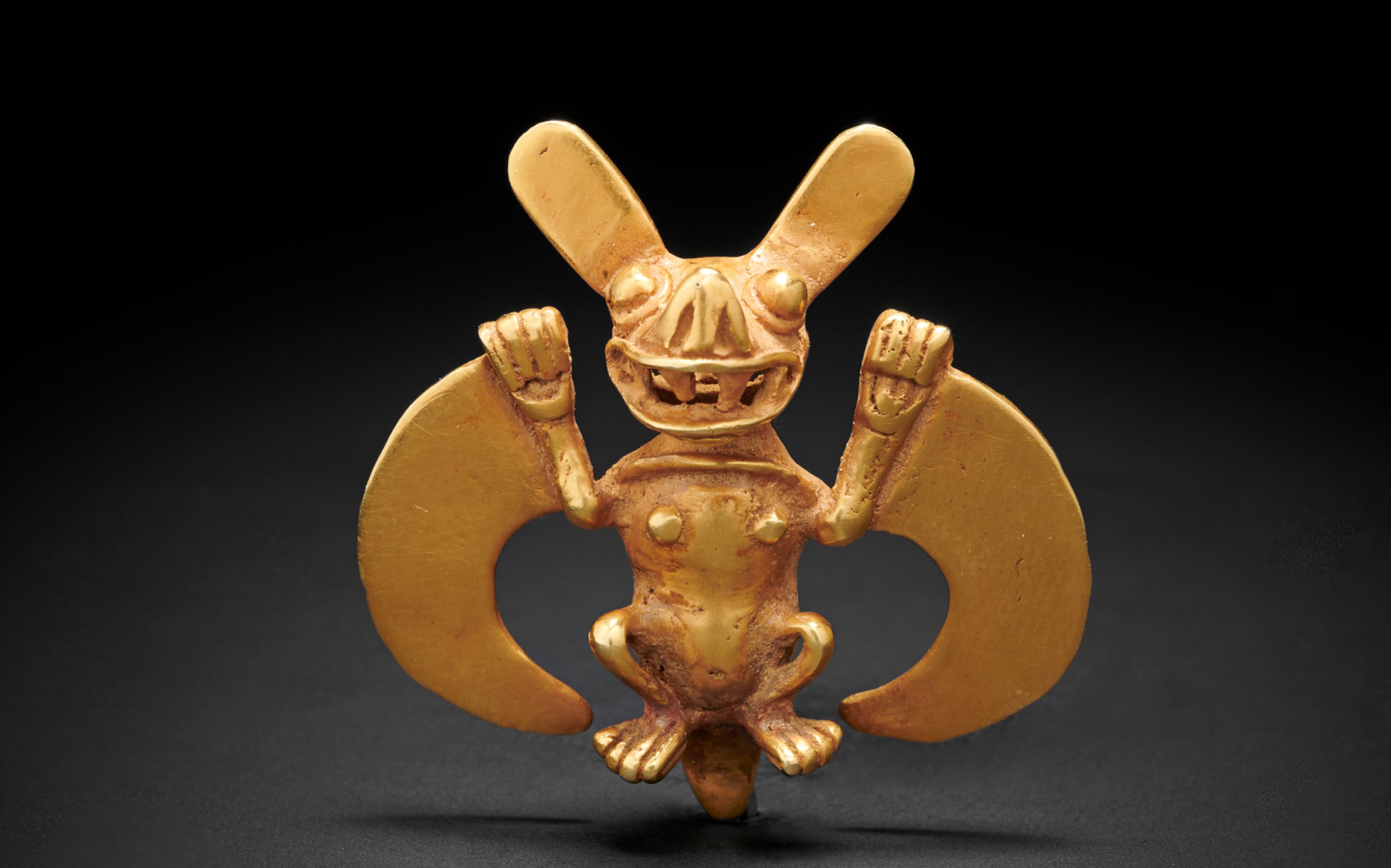 Comme l’axolotl placé sous la loupe il y a quelques mois, cet objet est minuscule : il n’en est pas moins plein d’une force qui tient à l’art avec lequel les orfèvres ont saisi les traits essentiels de l’animal. Il s’agit d’un pendentif pourvu d’un anneau de suspension dans le dos (fig. 2). Il représente une chauve-souris en vol, de face, ailes éployées. Hautes oreilles arrondies, nez en feuille, yeux en billes, grande bouche largement ouverte sur une rangée de grandes dents pointues : voilà notre animal, un mélange de fantaisie et de traits assez justement observés. À ses pattes antérieures dressées sont accrochées des ailes symétriques, en faucilles, formant autour du chiroptère une espèce de corolle. Corps de face, petits seins ronds suggérant peut-être qu’il s’agit d’une femelle, pattes arrière écartées, elle repose sur des pieds à quatre doigts, entre lesquels pend une petite queue triangulaire.
