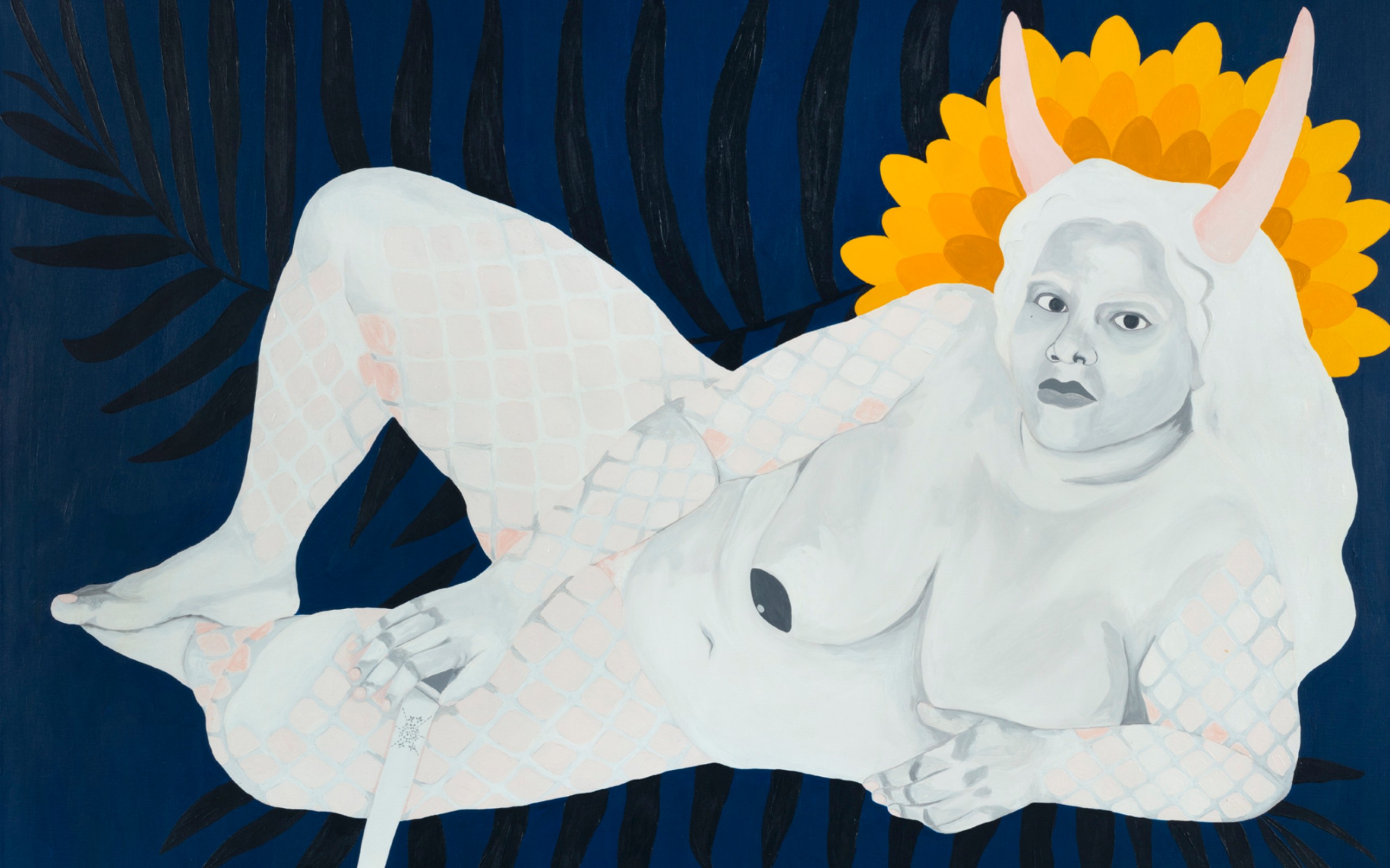 Dans le tableau de Tessa Mars intitulé L'Épouse, le corps nu d'une femme allongée sur un fond bleu foncé fait face au public. Sur ce fond, une feuille de palmier équilibre la composition et encadre la position du corps. Sur la tête du personnage se dressent deux cornes, et derrière elles, une couronne de pétales composée de trois teintes de jaune conduit les yeux de celui ou celle qui regarde l’œuvre directement à ceux de la figure. Son corps est blanc, avec quelques touches de rose clair et seuls son visage, ses pieds et sa poitrine ne sont pas recouverts de ce qui ressemble à des écailles. Bien que s’offrant au regard dans une position de détente, elle tient dans sa main droite un couteau et semble prête à se défendre ou attaquer.
