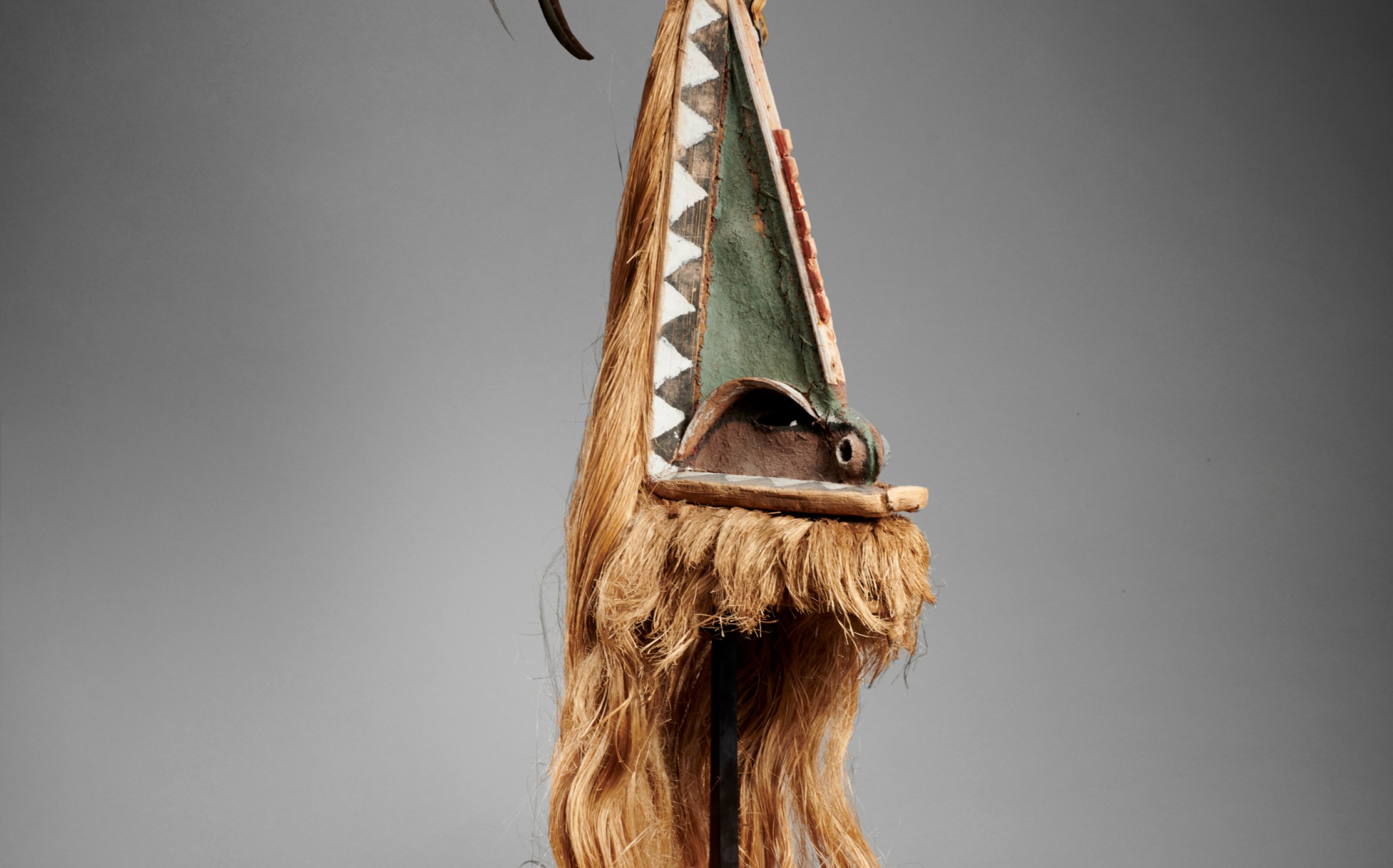 Ce masque aigu, tout en pointes et en triangles, a été fabriqué au Vanuatu, anciennement appelé Nouvelles-Hébrides. C’est un rarissime cas d’objet dont on connaît exactement l’origine géographique (le village de Fanla, sur l’île volcanique d’Ambrym), le commanditaire (le chef Tain Mal), le destinataire (le Commissaire-Résident Pierre Anthonioz), ainsi que la date de sa création (1957). L’occasion idéale de parler du Mage, un des rituels cérémoniels qui sous-tendent la vie sociale d’Ambrym…