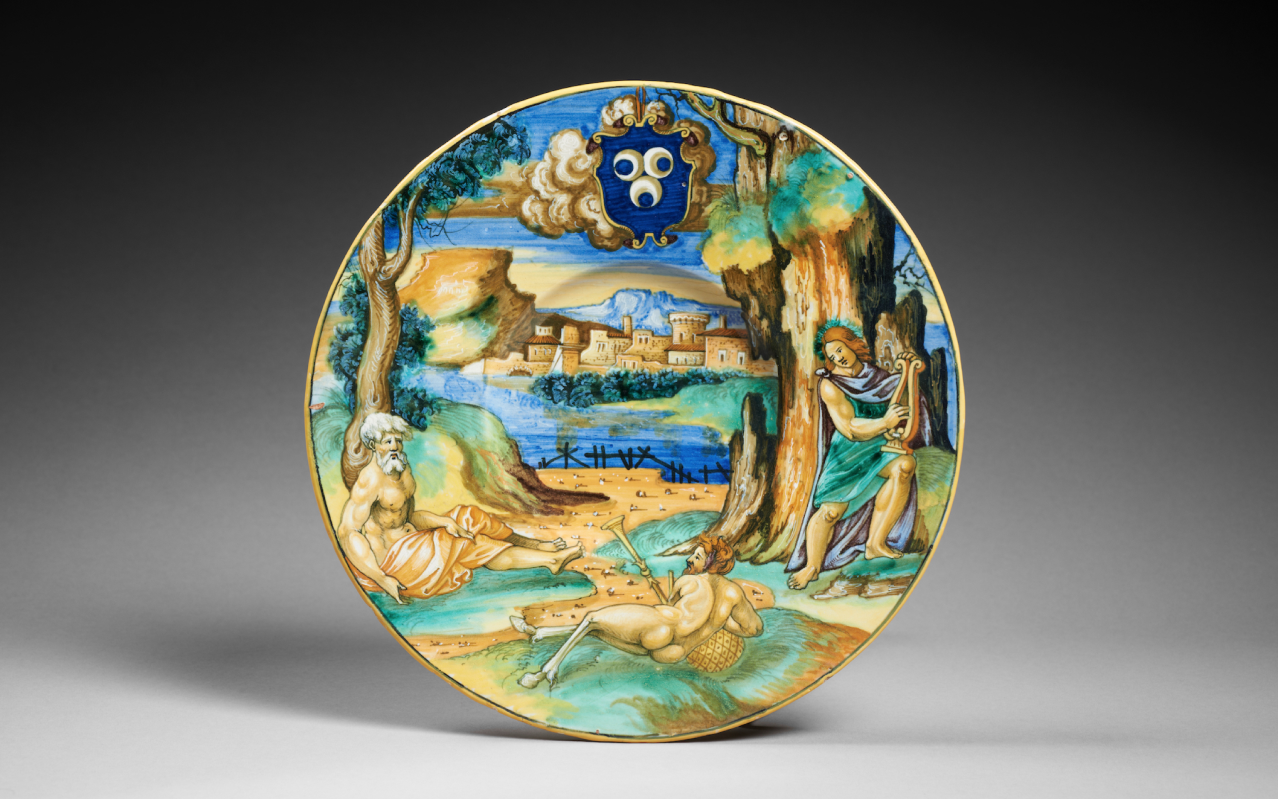 En témoigne ce plat en faïence émaillée, qui met en scène le concours musical opposant Apollon à Pan à son moment le plus décisif : celui de la victoire du dieu.