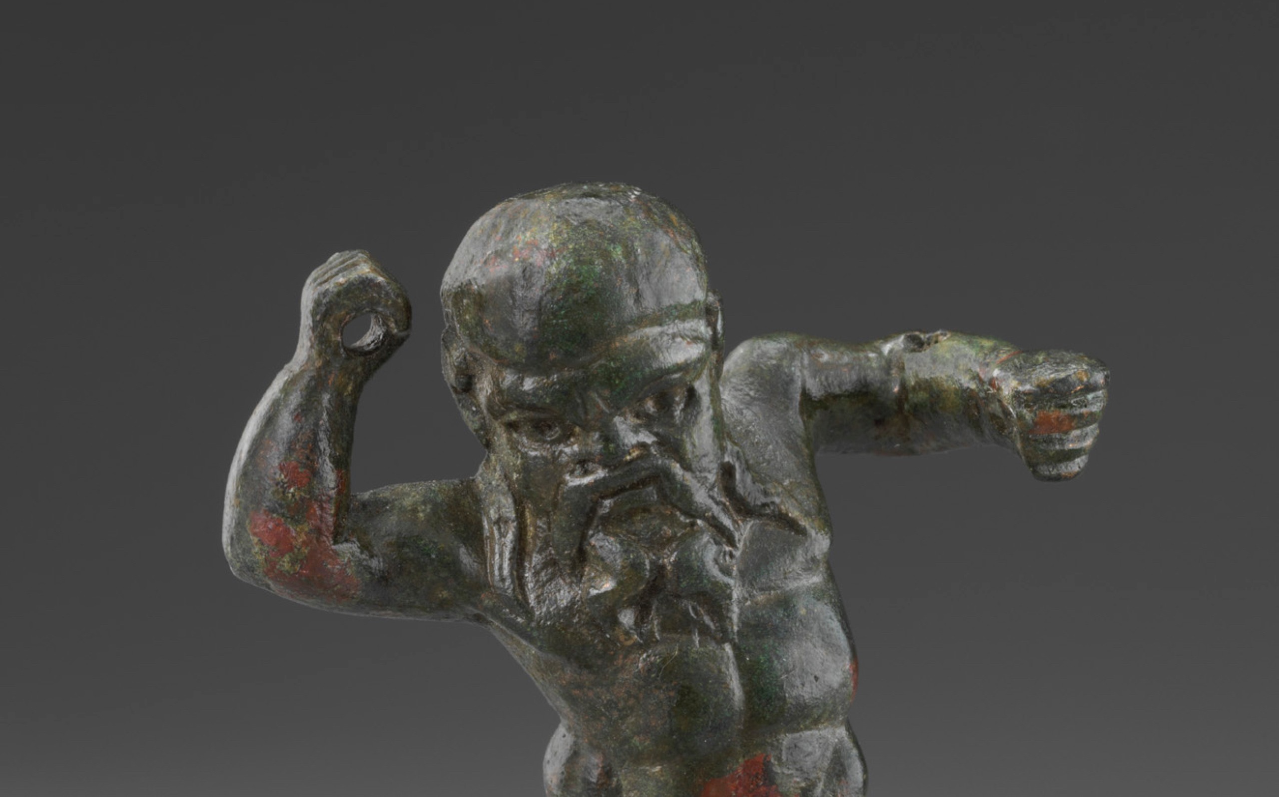 Heureusement, l’alliage de l’exemplaire du Musée de Lyon a été analysé : il est identique à celui de la vaisselle coulée et tournée32 , spécialité des ateliers de Campanie. Coulées dans un moule, les ébauches étaient finies par un ciselage à froid. Le sculpteur s’occupait des détails : rendu du volume de la musculature, relief de la barbe, incrustations diverses. Car, comme toutes les autres, les pupilles évidées de la statuette de la Fondation furent un jour incrustées d’autres matériaux. Plusieurs de ces statuettes – notamment celle du Walters Art Museum – ont en effet conservé des incrustations blanches et noires qui leur confèrent un magnétisme particulier.