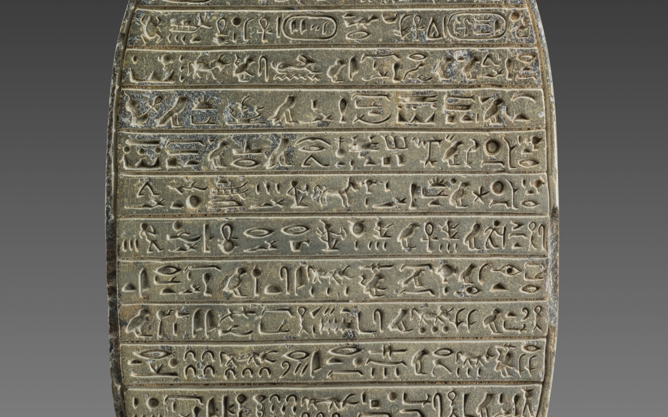En Égypte ancienne, le scarabée était un important symbole solaire, représentant l’astre à son lever. D’innombrables amulettes furent sculptées sous la forme de ce coléoptère. Le dessous de ces objets, souvent de petites dimensions, pouvait recevoir une courte inscription, un nom, une formule religieuse, etc. L’objet présenté ici appartient à cette famille, mais le roi Amenhotep III en a réinventé l’usage : ce scaraboïde sert d’outil de propagande à la gloire du souverain !