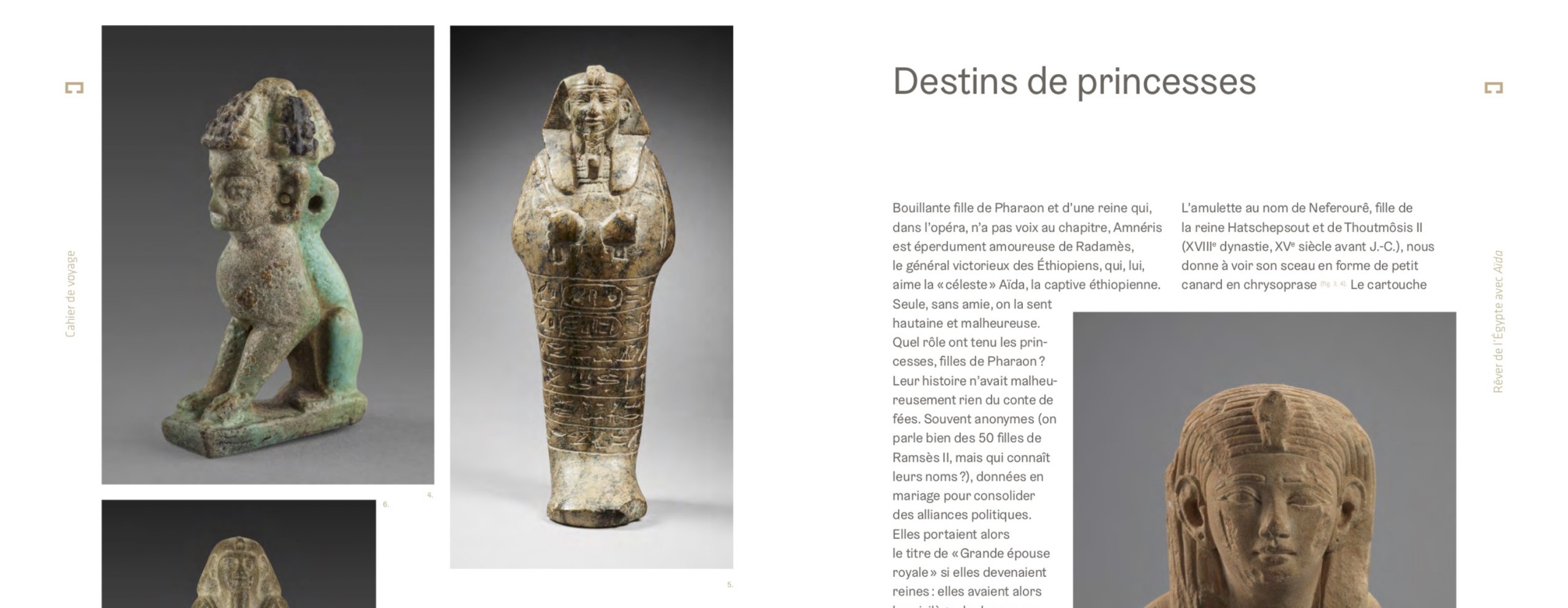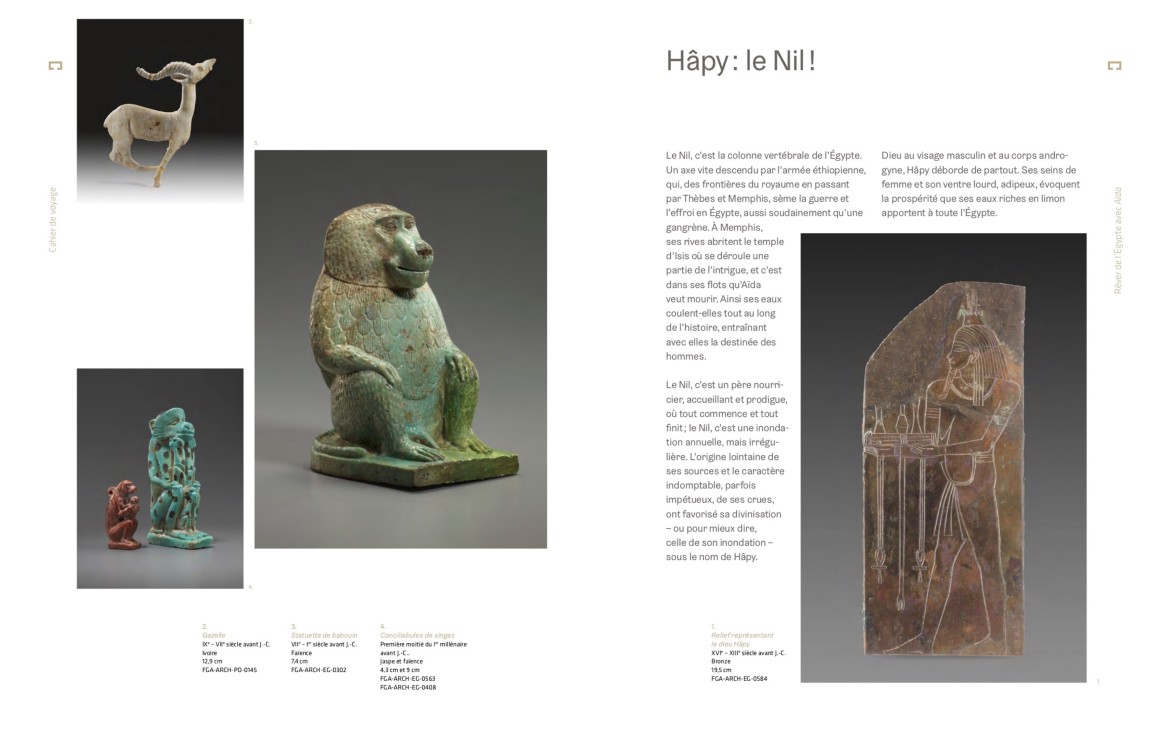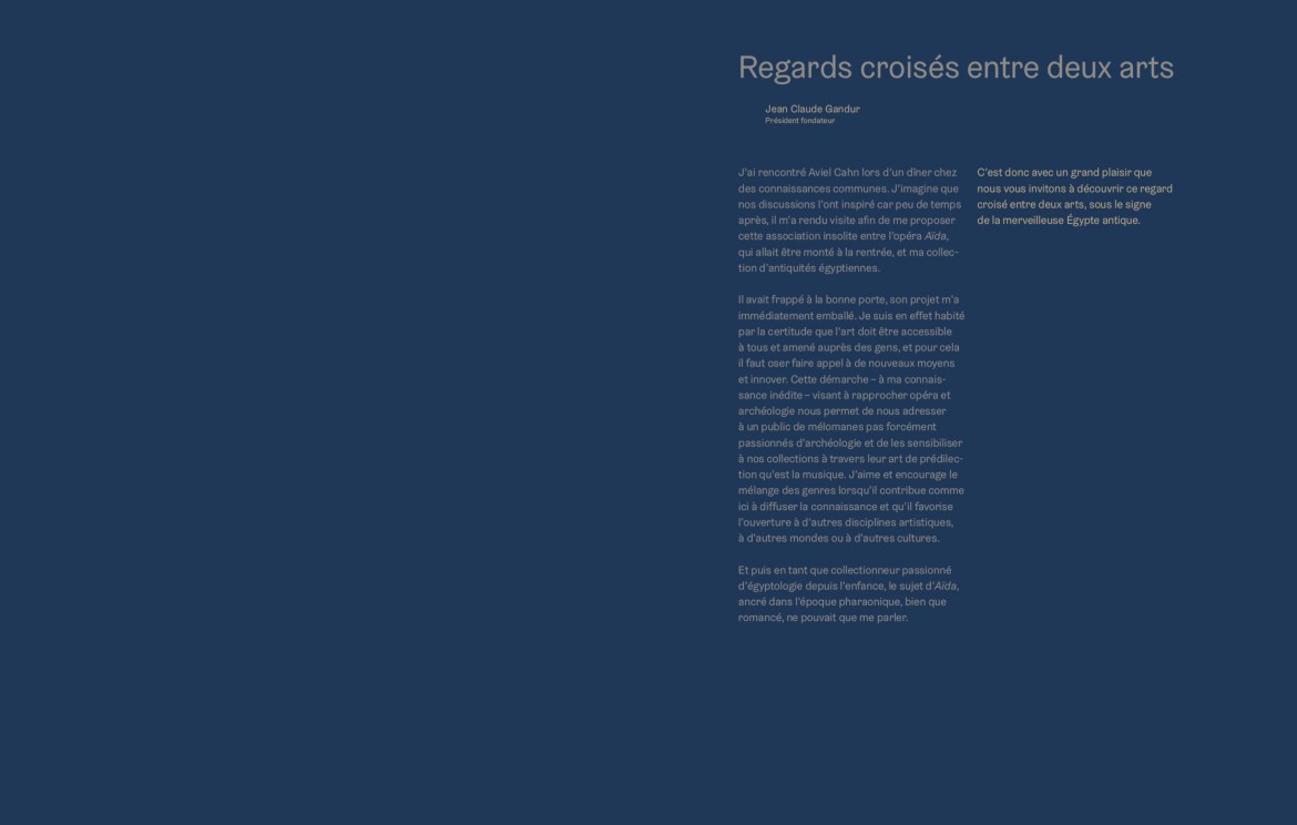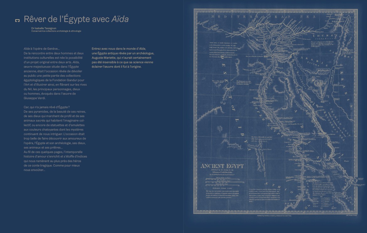 À l’occasion de la programmation d’Aïda, la Fondation convie le public des mélomanes à une rêverie archéologique sur les rives du Nil, en lui offrant, à la fin du spectacle, un livret intitulé Cahier de voyage. L’Égypte d’Aïda dans la collection d’archéologie de la Fondation Gandur pour l’Art.