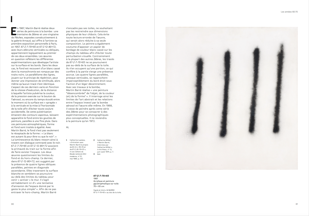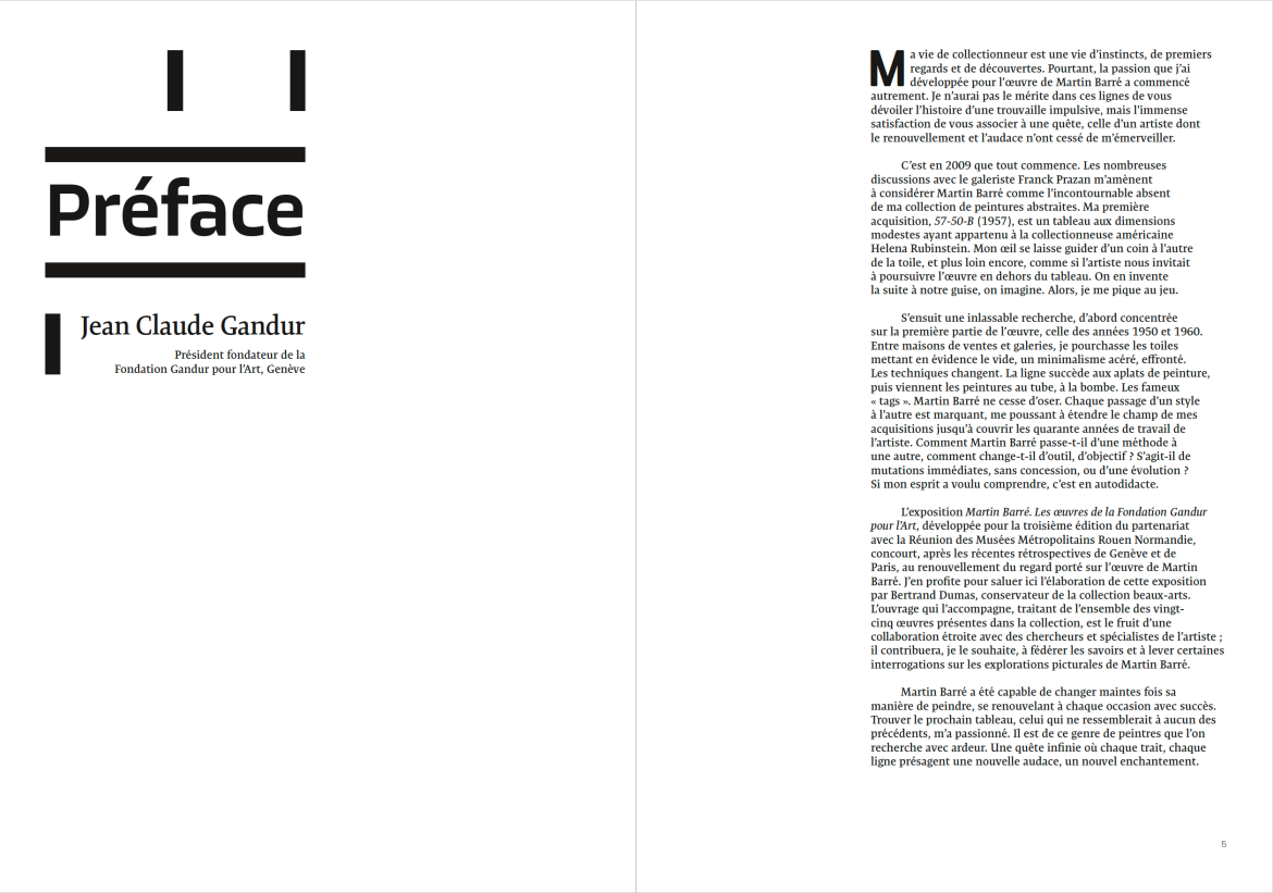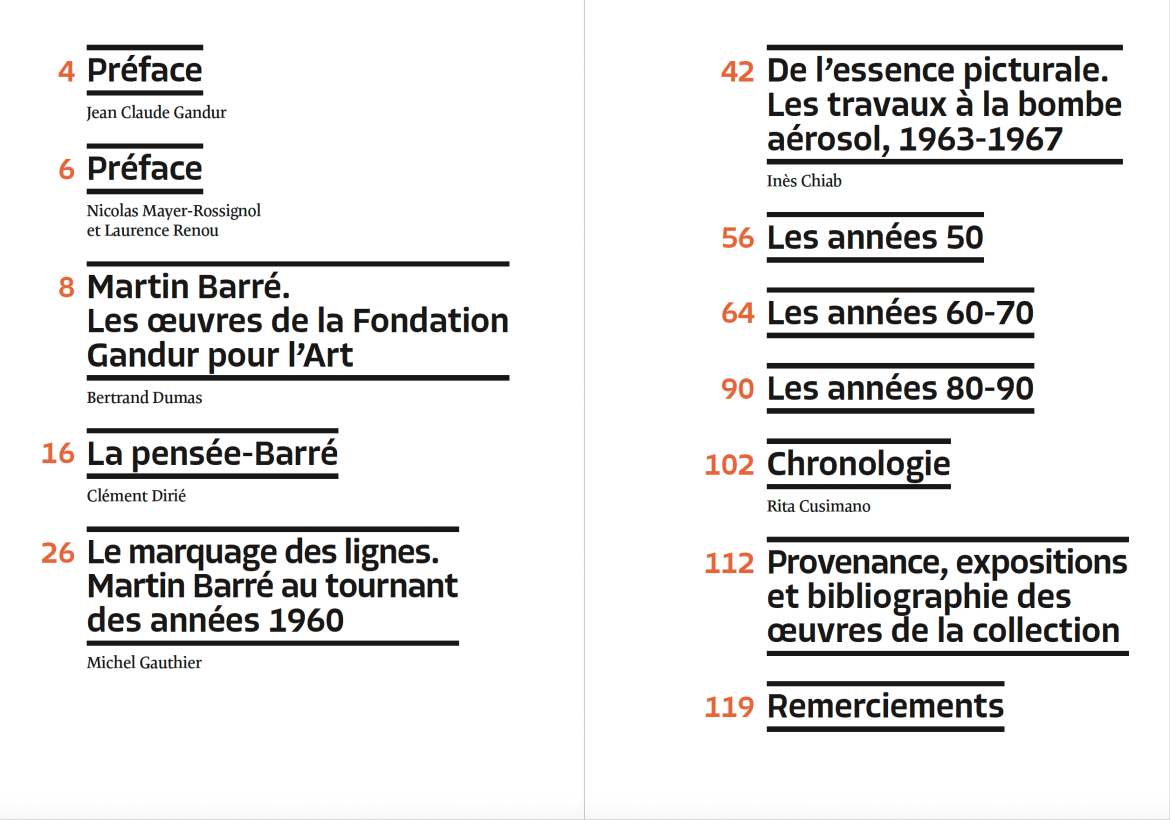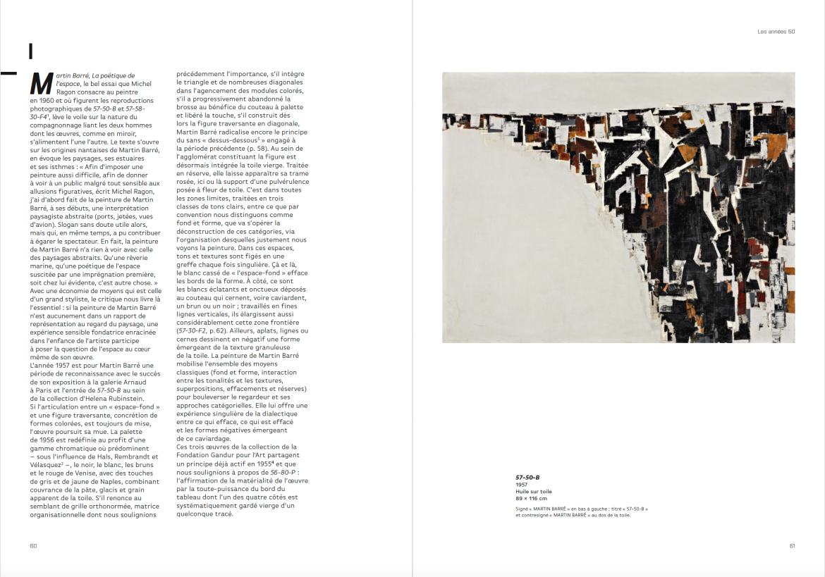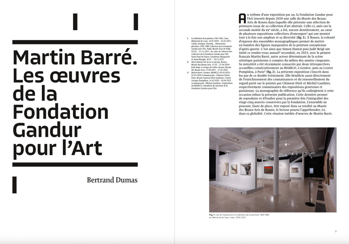 Sous la direction de Bertrand Dumas, commissaire de l’exposition et conservateur de la Fondation, l’ouvrage envisage la trajectoire artistique de Martin Barré dans son ensemble et propose une réflexion sur la genèse et le développement de cette collection que Jean Claude Gandur a patiemment et régulièrement développée depuis 2009. La publication compte plusieurs essais par des historiens de l’art et spécialistes de l’œuvre de Martin Barré, dont Michel Gauthier et Clément Dirié, qui, en 2021, avaient codirigé une monographie de référence sur l’artiste.